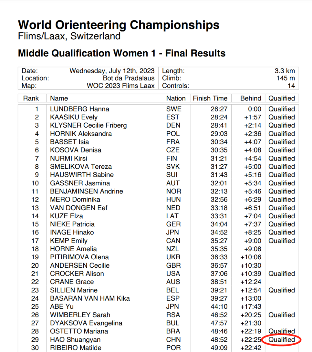 中国定向国家队员郝双燕和李卓业已晋级中距离决赛。