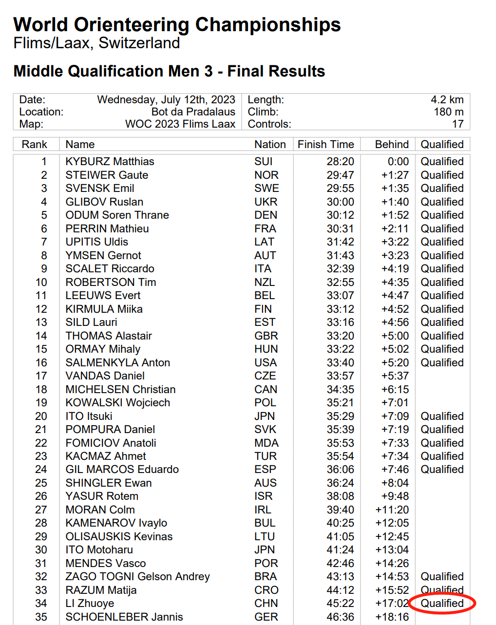 瑞典和瑞士分别赢得了三场中距离小组预赛胜利。Hanna Lundberg(瑞典)、Tove Alexandersson(瑞典)和 Simona Aebersold(瑞士)赢得了女子组预赛,而 Joey Hadorn(瑞士)、Albin Ridefelt(瑞典)和 Matthias Kyburz(瑞士)则在男子组预赛的三个小组比赛中占据主导地位。每场小组预赛跑得最快的15名选手将有资格参加7月15日周六的中距离决赛。